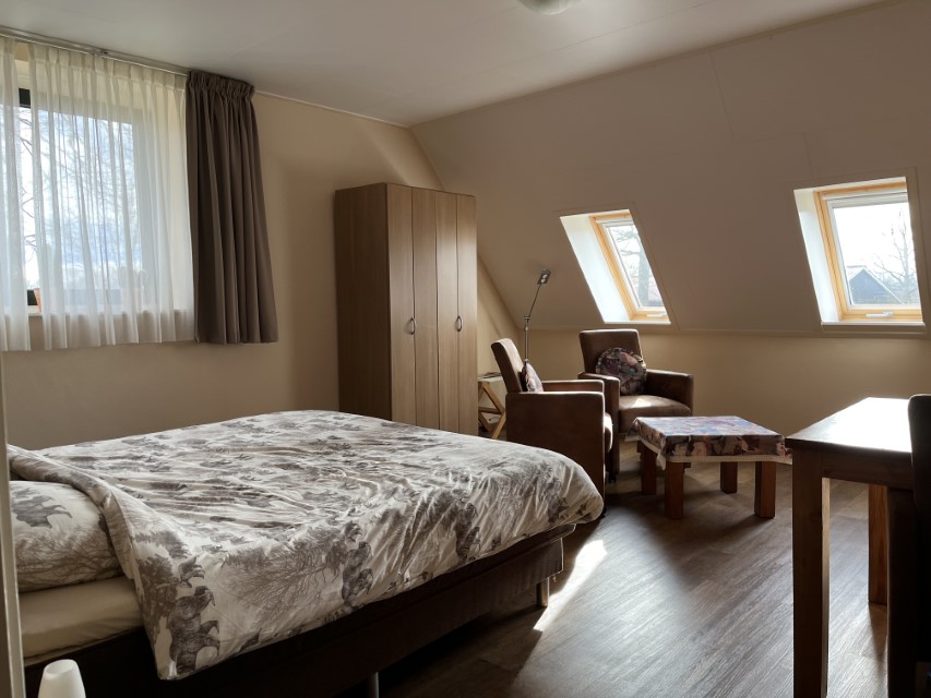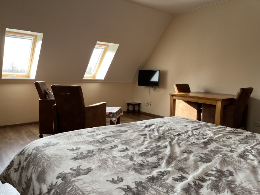 is geschikt voor 2 personen en bestaat uit een zeer ruime zit/slaapkamer, hoge tafel met 2 stoelen, zitbank, TV en een badkamer met toilet, douche en ligbad. In deze boerderijkamer staat een zitbank welke eenvoudig kan worden omgebouwd tot een 2-persoons bed, zodat in deze boerderijkamer ook 4 personen kunnen overnachten.