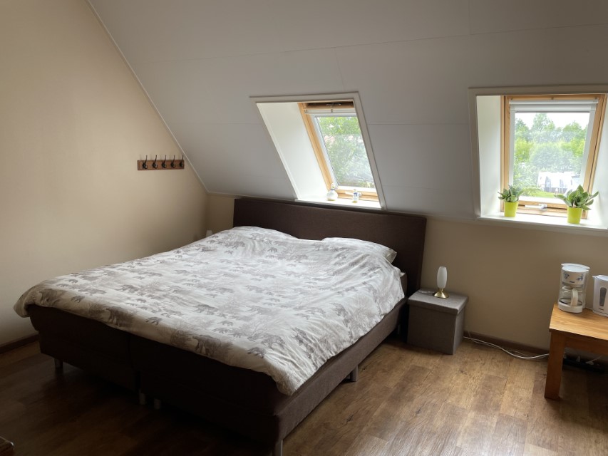 is geschikt voor 2 personen en bestaat uit een zit/slaapkamer met 2-persoons bed (eventueel als 2 gescheiden éénpersoonsbedden op te maken), lage zit met 2 stoelen, TV en een badkamer met toilet, douche en ligbad.